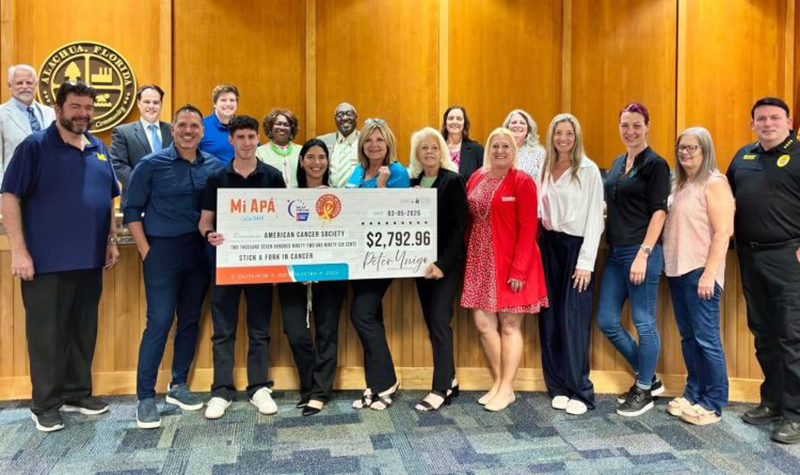 Alachua elected officials and city staff serve food to diners during the “Stick a Fork in Cancer” fundraiser held March 5, 2026, at Mi Apa Latin Café in Alachua. The annual event supports the American Cancer Society’s Relay for Life, with a portion of the day’s restaurant proceeds donated to cancer research and patient services. / Photo special to Alachua County Today