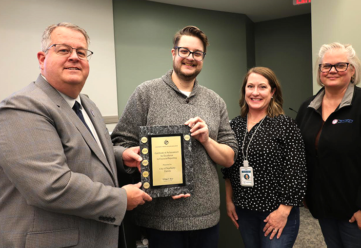 L-R: Newberry Mayor Tim Marden, left, presents a plaque recognizing the City of Newberry’s seventh consecutive Certificate of Achievement for Excellence in Financial Reporting from the Government Finance Officers Association to Assistant City Manager and Chief Financial Officer Dallas Lee, Assistant Director of Finance and Administration Amanda Hagan, and Human Resource Generalist Tracy Fair during the Feb. 9 City Commission meeting. / Photo special to Alachua County Today
