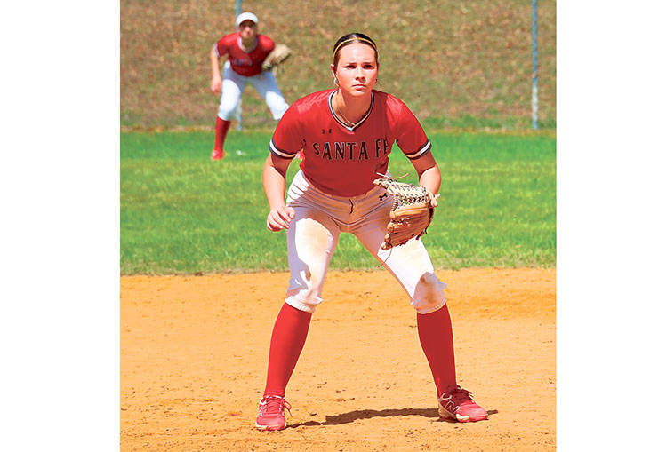 A Santa Fe High School infielder prepares for a play during action at the 49th Annual Santa Fe Raider Softball Classic held at the Hal Brady Complex. / Photo by RILEY APPLEBEE