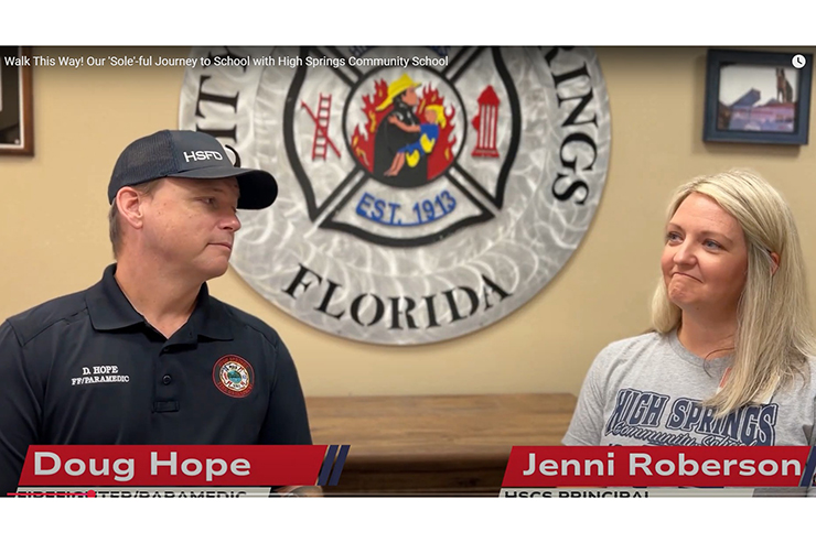 HIGH SPRINGS ‒ A lighthearted approach is helping spread a serious message about pedestrian safety as High Springs prepares to take part in International Walk to School Day. Firefighter/Paramedic Doug Hope and High Springs Community School Principal Jenni Roberson teamed up to create a pun-filled video promoting the annual event and reminding students of safe walking habits.
