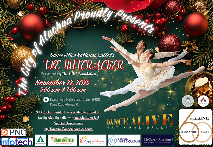 ALACHUA — The holiday season will take center stage in Alachua as Dance Alive National Ballet presents a free community performance of The Nutcracker on Saturday, Nov. 22, 2025, at the Legacy Park Multipurpose Center. The City of Alachua is hosting the event, which features two showtimes, at 3 p.m. and 7 p.m., and is open to all residents at no cost.