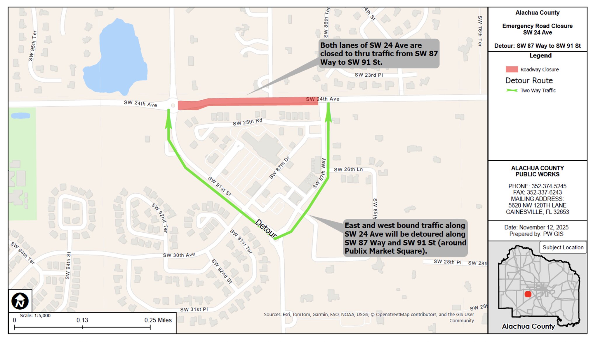 Drivers will be detoured around the area using SW 87th Way to SW 91st Street. Residents of the Shannon Woods subdivision, exiting the neighborhood using SW 88th Street, will only be able to go east on SW 24th Avenue.