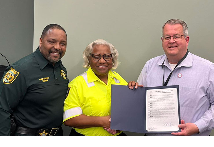 Alachua County Sheriff Chad Scott (left) and Newberry Mayor Tim Marden (right) present a proclamation honoring Crossing Guard of the Year Calita Wilcox during the Feb. 23, 2026, Newberry City Commission meeting./Photo special to Alachua County Today